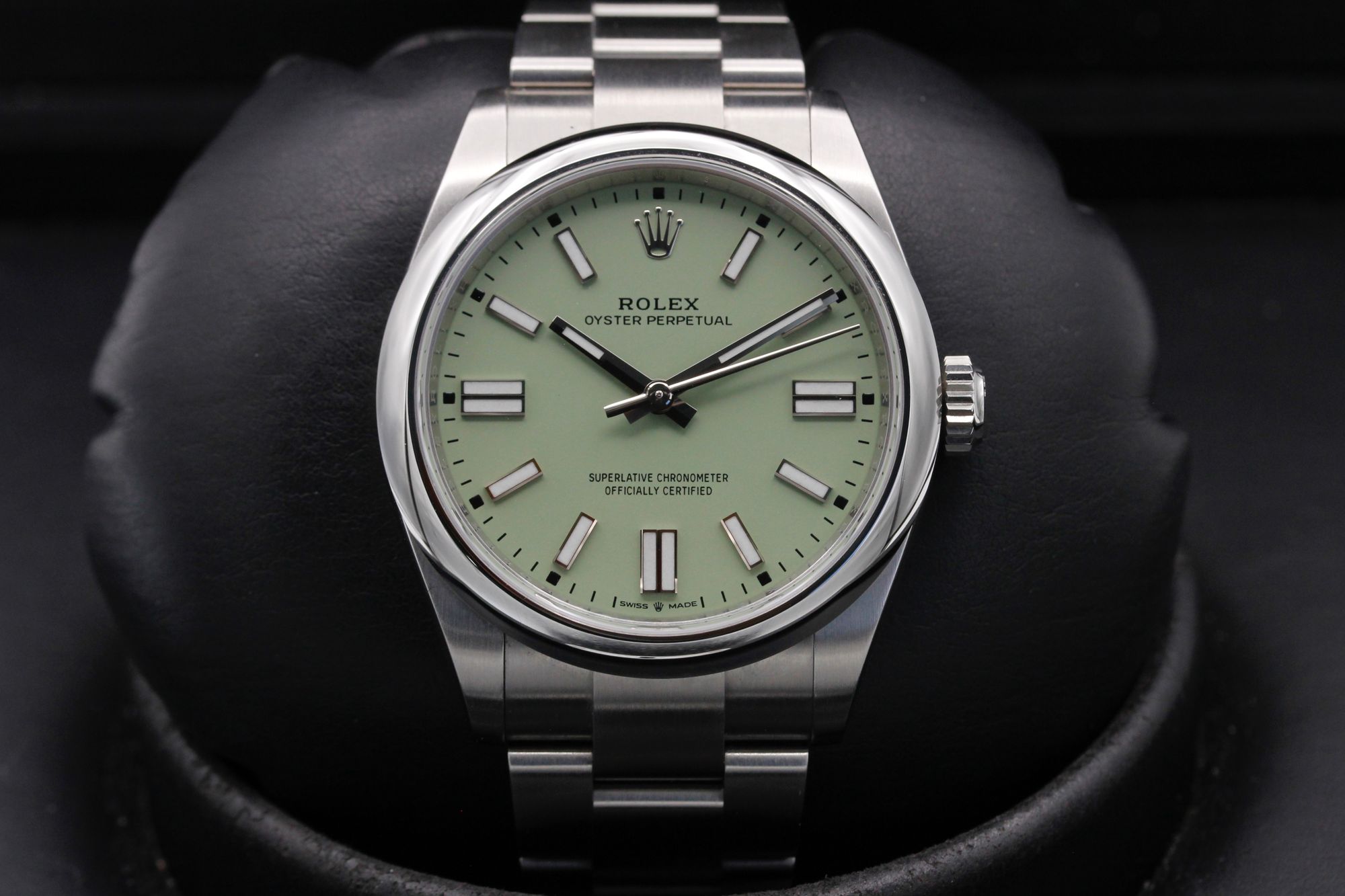 This Rolex Oyster Perpetual 41 134300 has a pistachio dial and a bracelet strap. This Rolex has undergone a thorough inspection of water resistance, accuracy, functionality and condition to determine the level of reconditioning required to meet our strict standards. It has also been referenced against technical documents and manufacturer records where available to ensure authenticity and a clean history. Our watches have a 24-month warranty for your peace of mind, in conjunction with any remaining manufacturer’s warranty from new or from service. To maintain the manufacturer’s warranty on this watch, it has not been polished in our service centre.