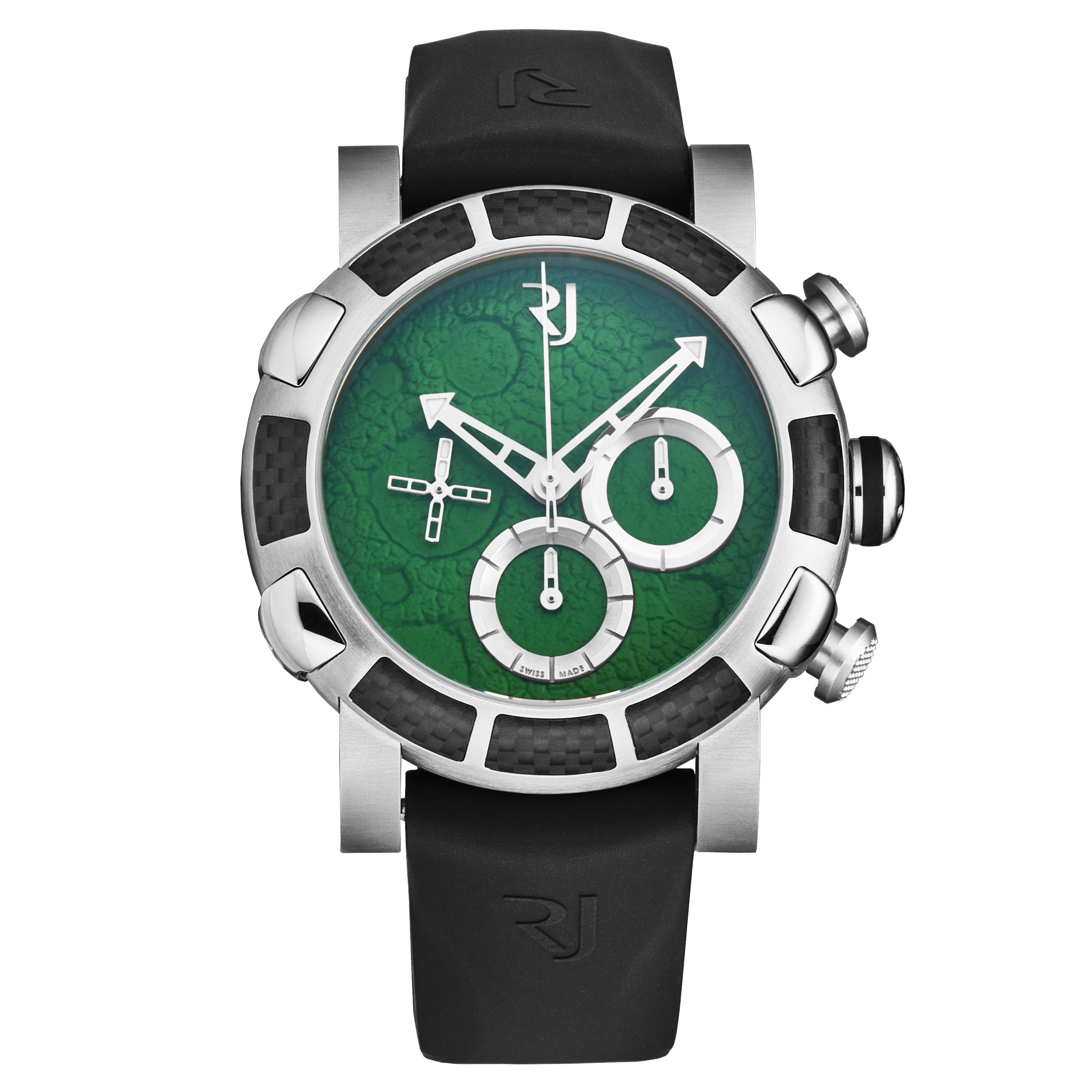 This Romain Jerome Moon Dust RJ.MD.CH.601.10 has a green dial and a rubber strap. This Romain Jerome has undergone a thorough inspection of water resistance, accuracy, functionality and condition to determine the level of reconditioning required to meet our strict standards. It has also been referenced against technical documents and manufacturer records where available to ensure authenticity and a clean history. All our watches have a 24-month warranty for your peace of mind.