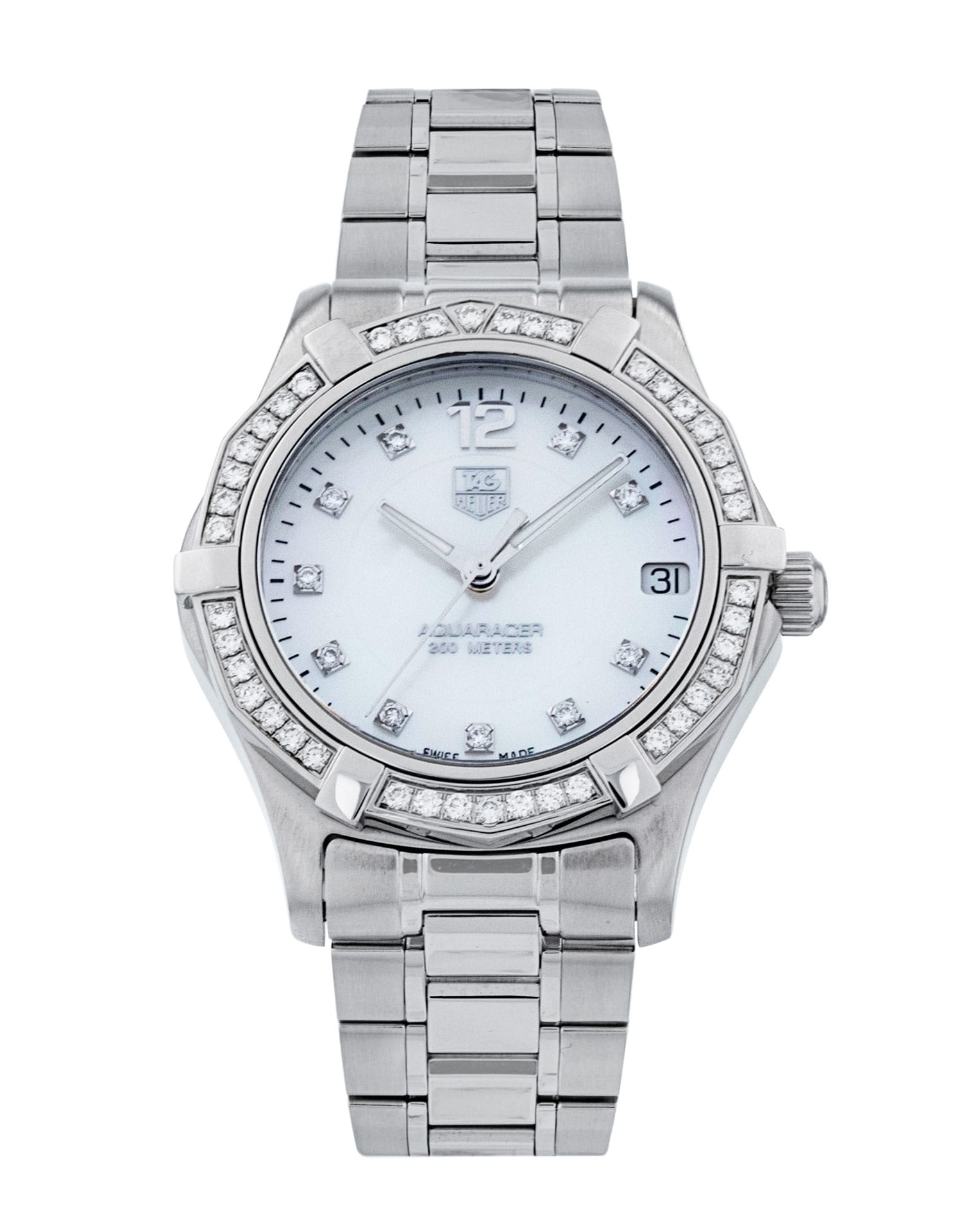 This Tag Heuer Aquaracer WAF1313.BA0819 has a mother of pearl white - diamond dial and a bracelet strap. This Tag Heuer has undergone a thorough inspection of accuracy, functionality and condition at our Tag Heuer certified service centre to determine the level of reconditioning required to meet our strict standards. It has also been checked against our records to ensure authenticity. All our watches have a 24-month warranty for your peace of mind.