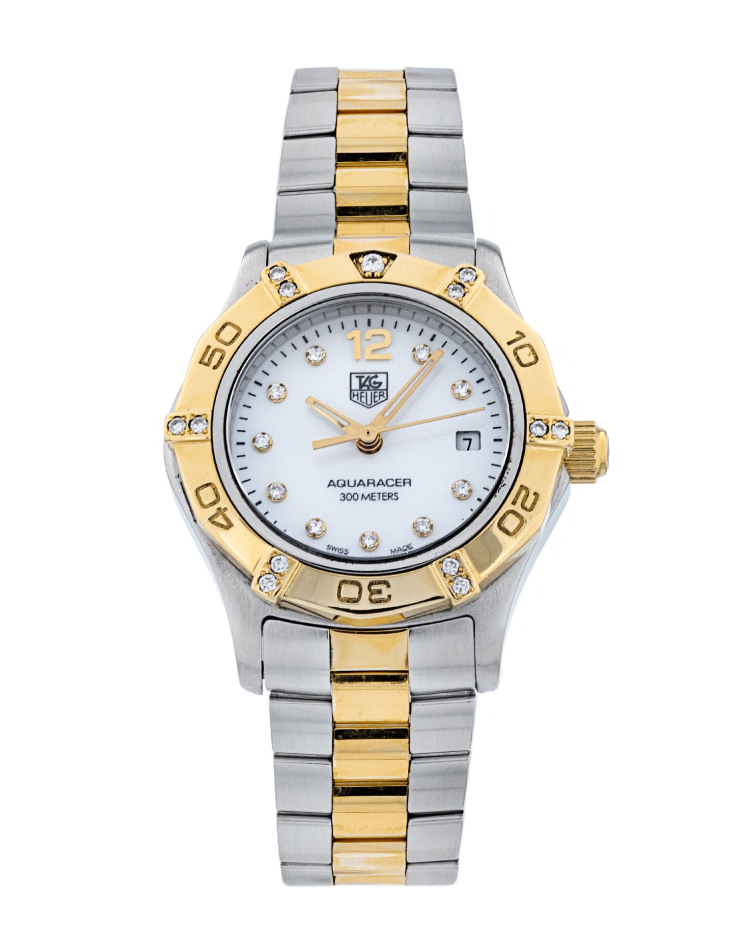 This Tag Heuer Aquaracer WAF1451.BB0825 has a mother of pearl white - diamond dial and a bracelet strap. This Tag Heuer has undergone a thorough inspection of accuracy, functionality and condition at our Tag Heuer certified service centre to determine the level of reconditioning required to meet our strict standards. It has also been checked against our records to ensure authenticity. All our watches have a 24-month warranty for your peace of mind.