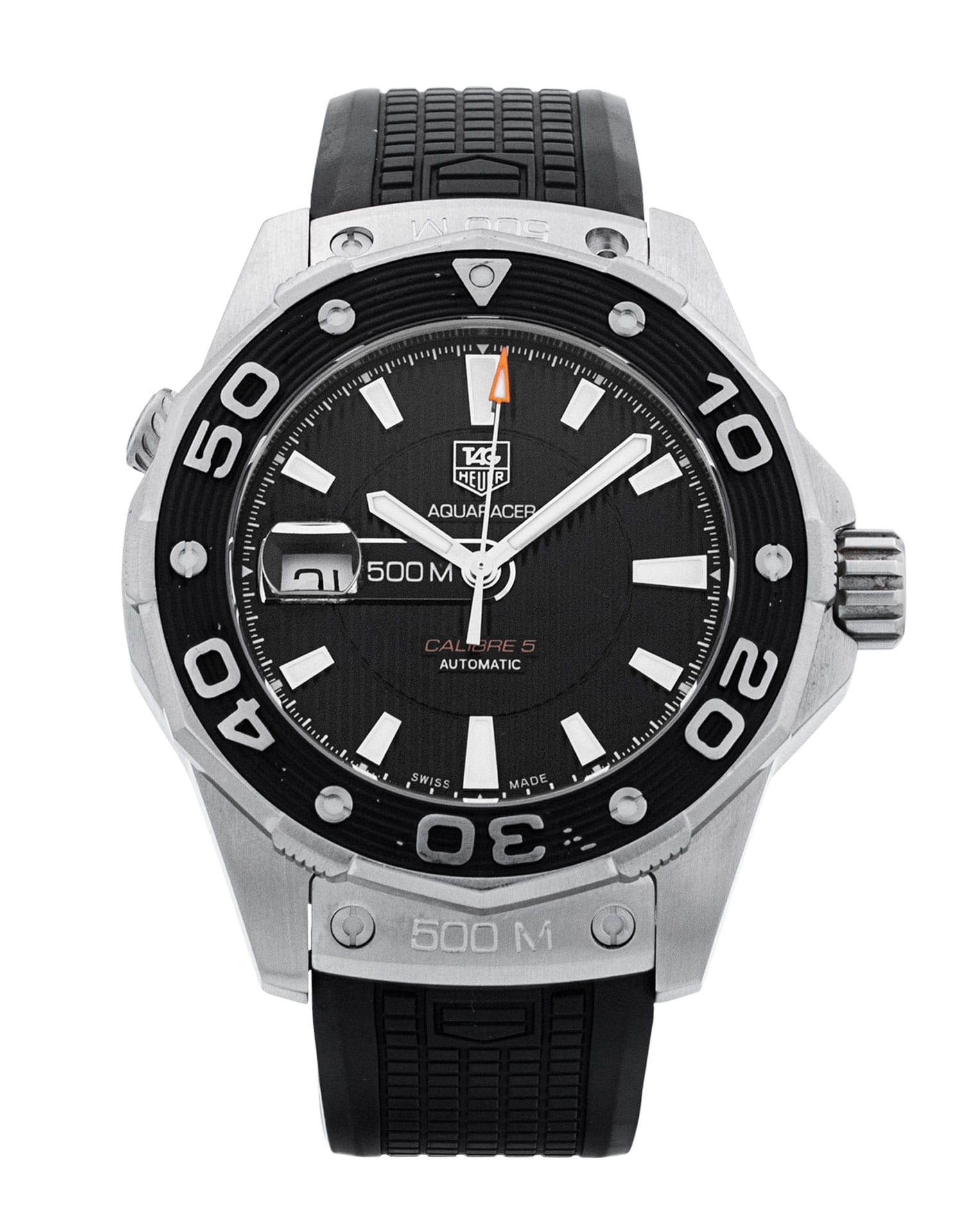 This Tag Heuer Aquaracer WAJ2110.FT6015 has a black baton dial and a rubber strap. This Tag Heuer has undergone a thorough inspection of accuracy, functionality and condition at our Tag Heuer certified service centre to determine the level of reconditioning required to meet our strict standards. It has also been checked against our records to ensure authenticity. All our watches have a 24-month warranty for your peace of mind.