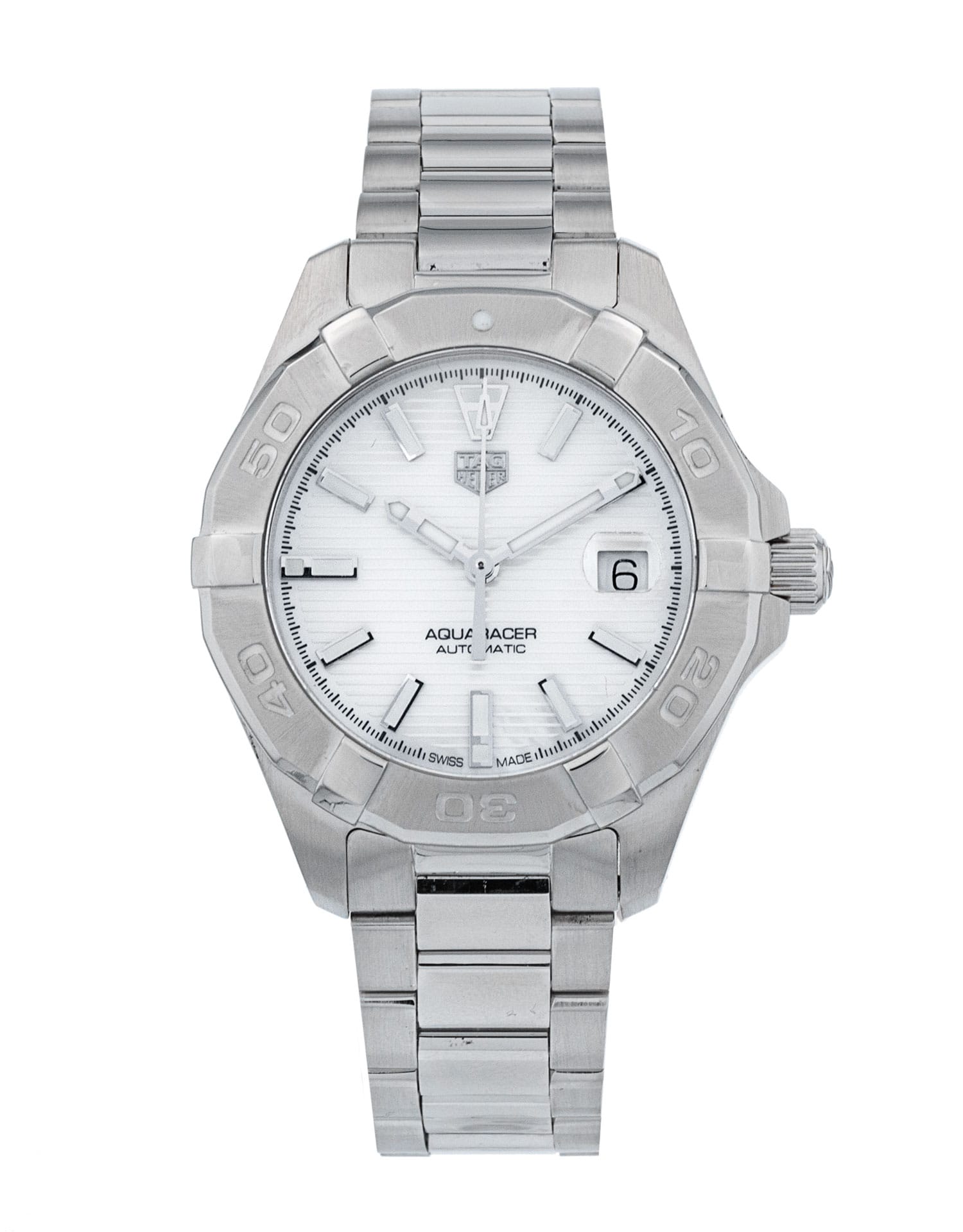 This Tag Heuer Aquaracer WBD2311.BA0740 has a mother of pearl white baton dial and a bracelet strap. This Tag Heuer has undergone a thorough inspection of accuracy, functionality and condition at our Tag Heuer certified service centre to determine the level of reconditioning required to meet our strict standards. It has also been checked against our records to ensure authenticity. All our watches have a 24-month warranty for your peace of mind.