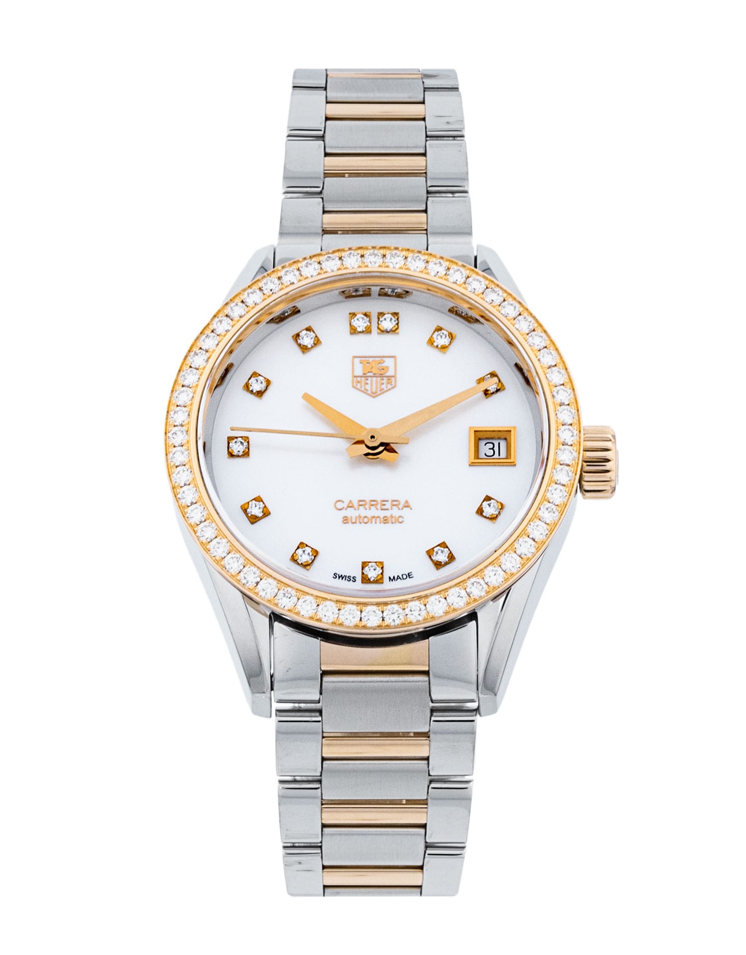 This Tag Heuer Carrera Ladies WAR2453.BD0772 has a mother of pearl white - diamond dial and a bracelet strap. This Tag Heuer has undergone a thorough inspection of accuracy, functionality and condition at our Tag Heuer certified service centre to determine the level of reconditioning required to meet our strict standards. It has also been checked against our records to ensure authenticity. All our watches have a 24-month warranty for your peace of mind.