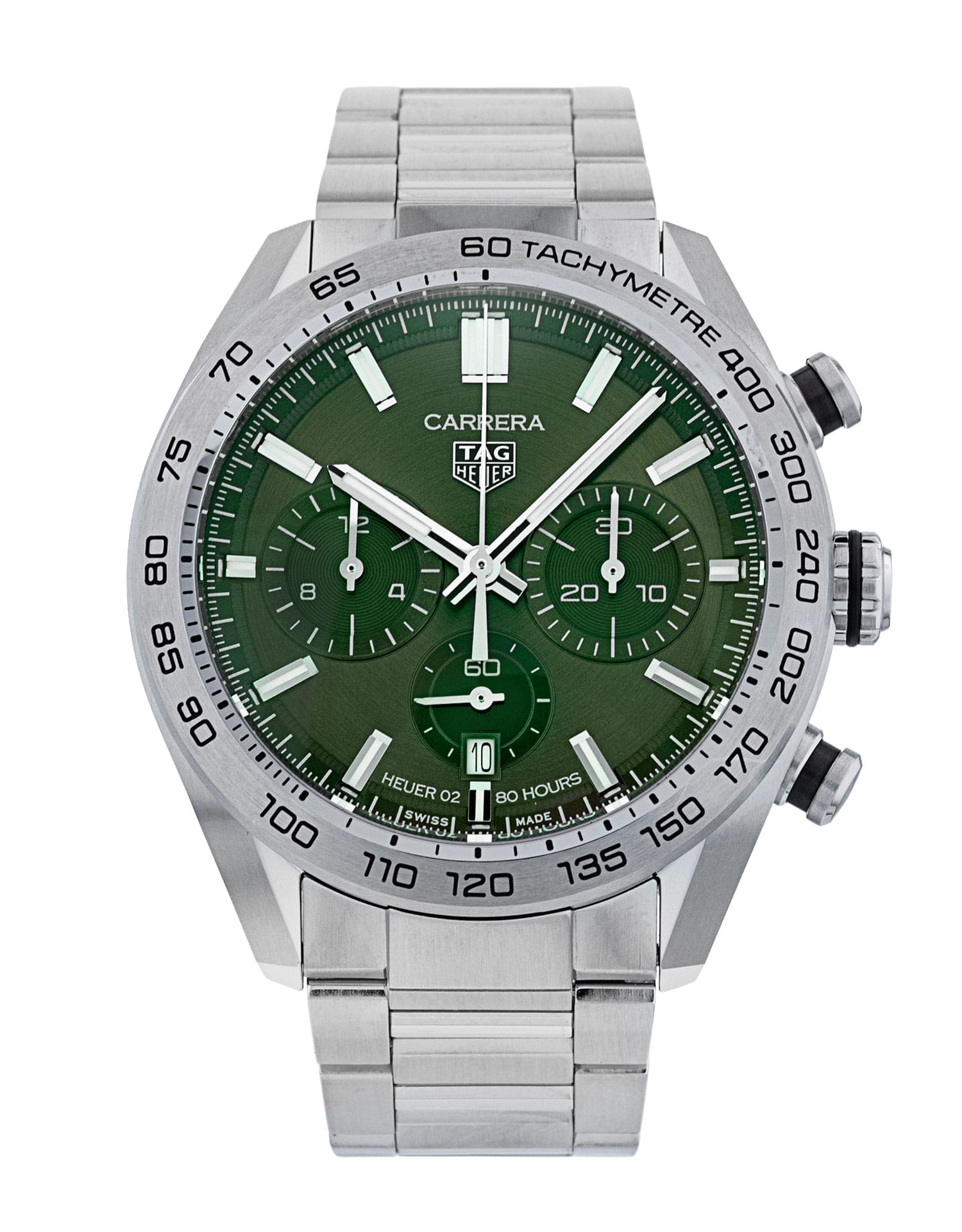 This Tag Heuer Carrera CBN2A10.BA0643 has a green baton dial and a bracelet strap. This Tag Heuer has undergone a thorough inspection of accuracy, functionality and condition at our Tag Heuer certified service centre to determine the level of reconditioning required to meet our strict standards. It has also been checked against our records to ensure authenticity. All our watches have a 24-month warranty for your peace of mind.