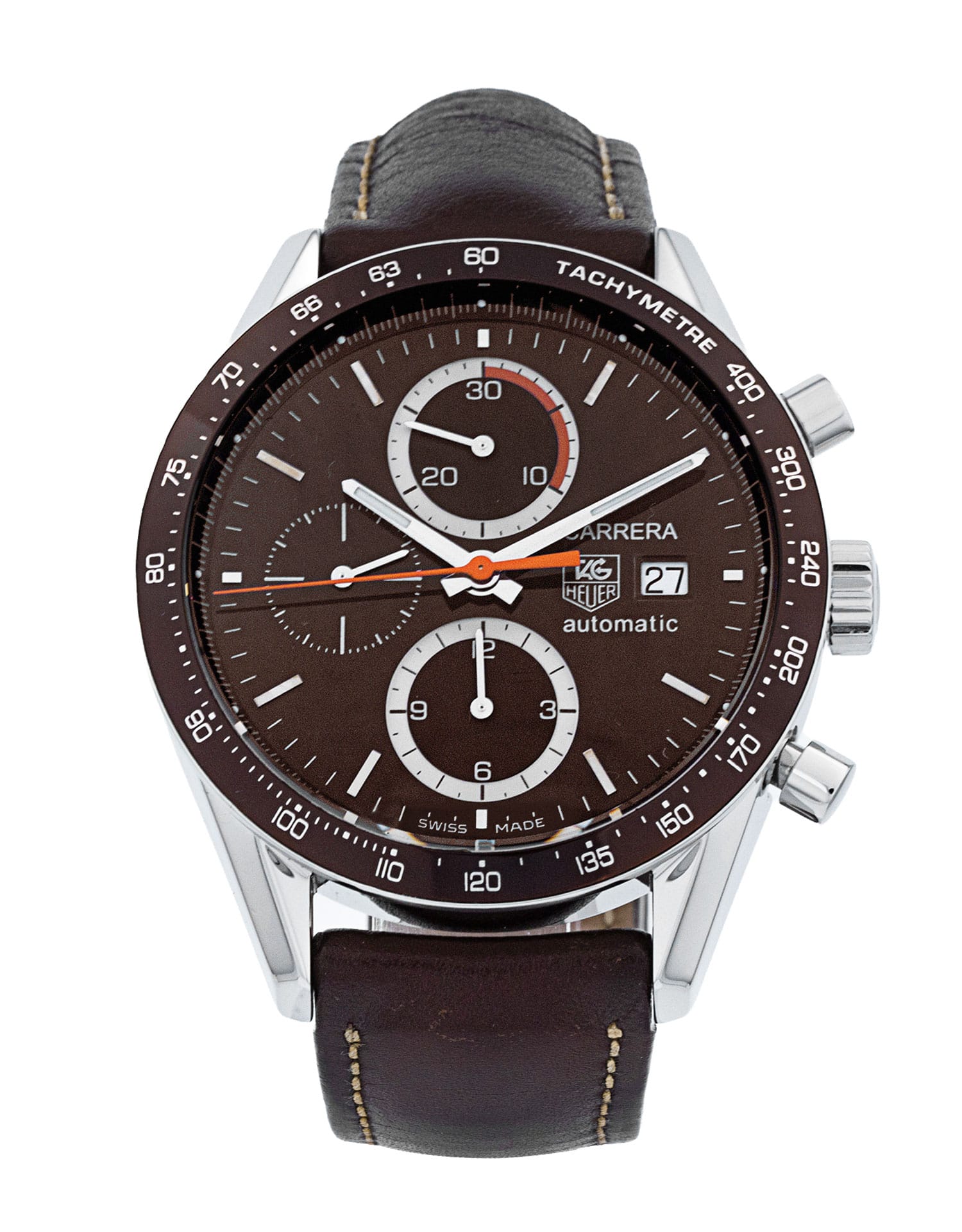This Tag Heuer Carrera CV2013.FC6234 has a brown baton dial and a leather strap. This Tag Heuer has undergone a thorough inspection of accuracy, functionality and condition at our Tag Heuer certified service centre to determine the level of reconditioning required to meet our strict standards. It has also been checked against our records to ensure authenticity. All our watches have a 24-month warranty for your peace of mind.