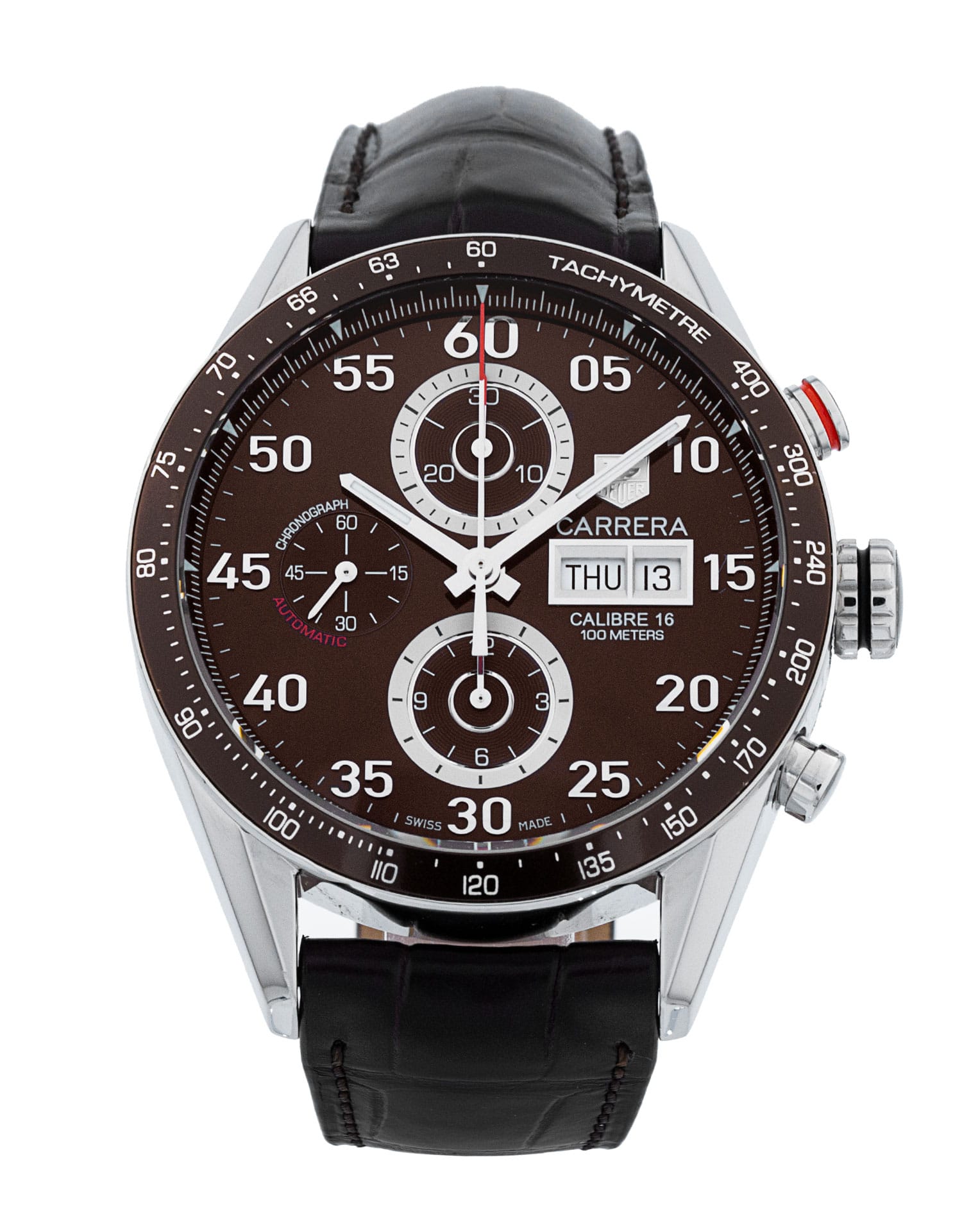 This Tag Heuer Carrera CV2A12.FC6236 has a brown arabic dial and a leather strap. This Tag Heuer has undergone a thorough inspection of accuracy, functionality and condition at our Tag Heuer certified service centre to determine the level of reconditioning required to meet our strict standards. It has also been checked against our records to ensure authenticity. All our watches have a 24-month warranty for your peace of mind.