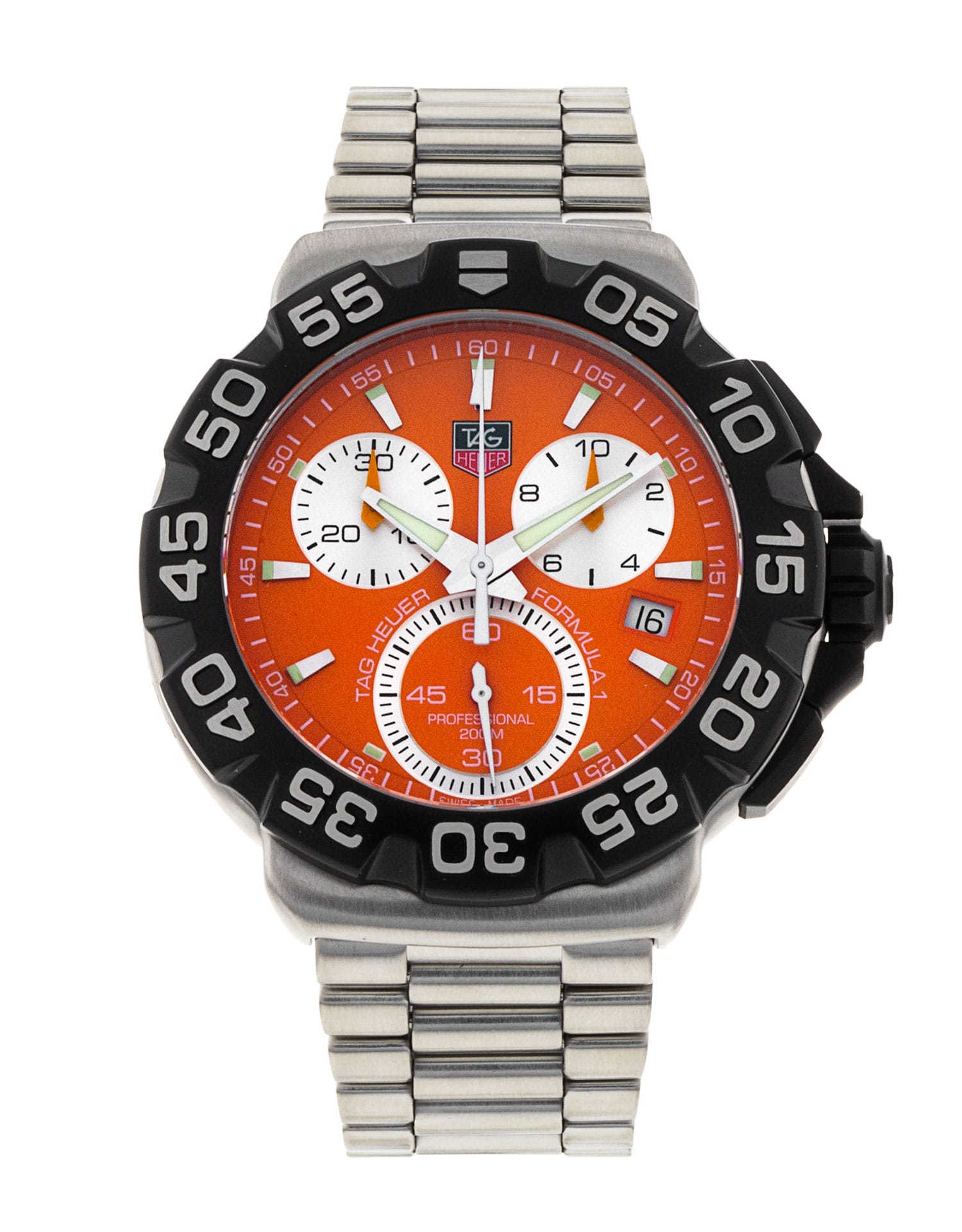 This Tag Heuer Formula 1 CAH1113.BA0850 has a orange baton dial and a bracelet strap. This Tag Heuer has undergone a thorough inspection of accuracy, functionality and condition at our Tag Heuer certified service centre to determine the level of reconditioning required to meet our strict standards. It has also been checked against our records to ensure authenticity. All our watches have a 24-month warranty for your peace of mind.