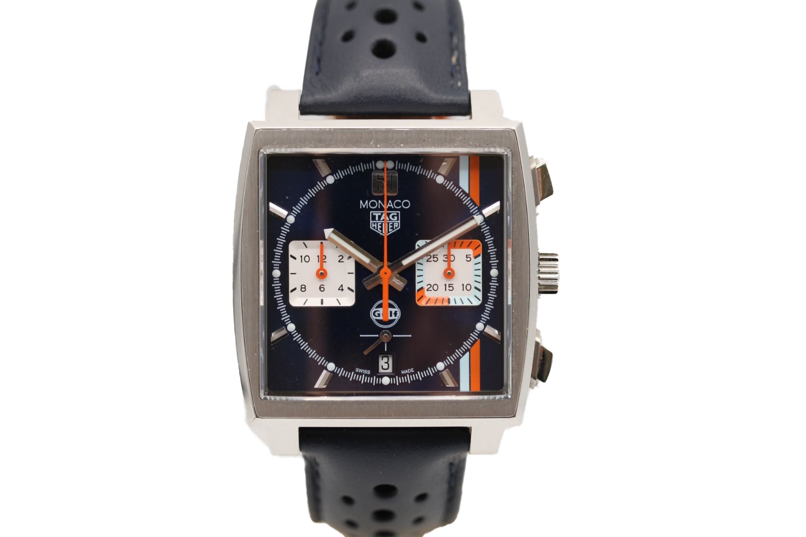 This Tag Heuer Monaco CBL2115.FC6494 has a blue dial and a leather strap. This Tag Heuer has undergone a thorough inspection of accuracy, functionality and condition at our Tag Heuer certified service centre to determine the level of reconditioning required to meet our strict standards. It has also been checked against our records to ensure authenticity. All our watches have a 24-month warranty for your peace of mind.