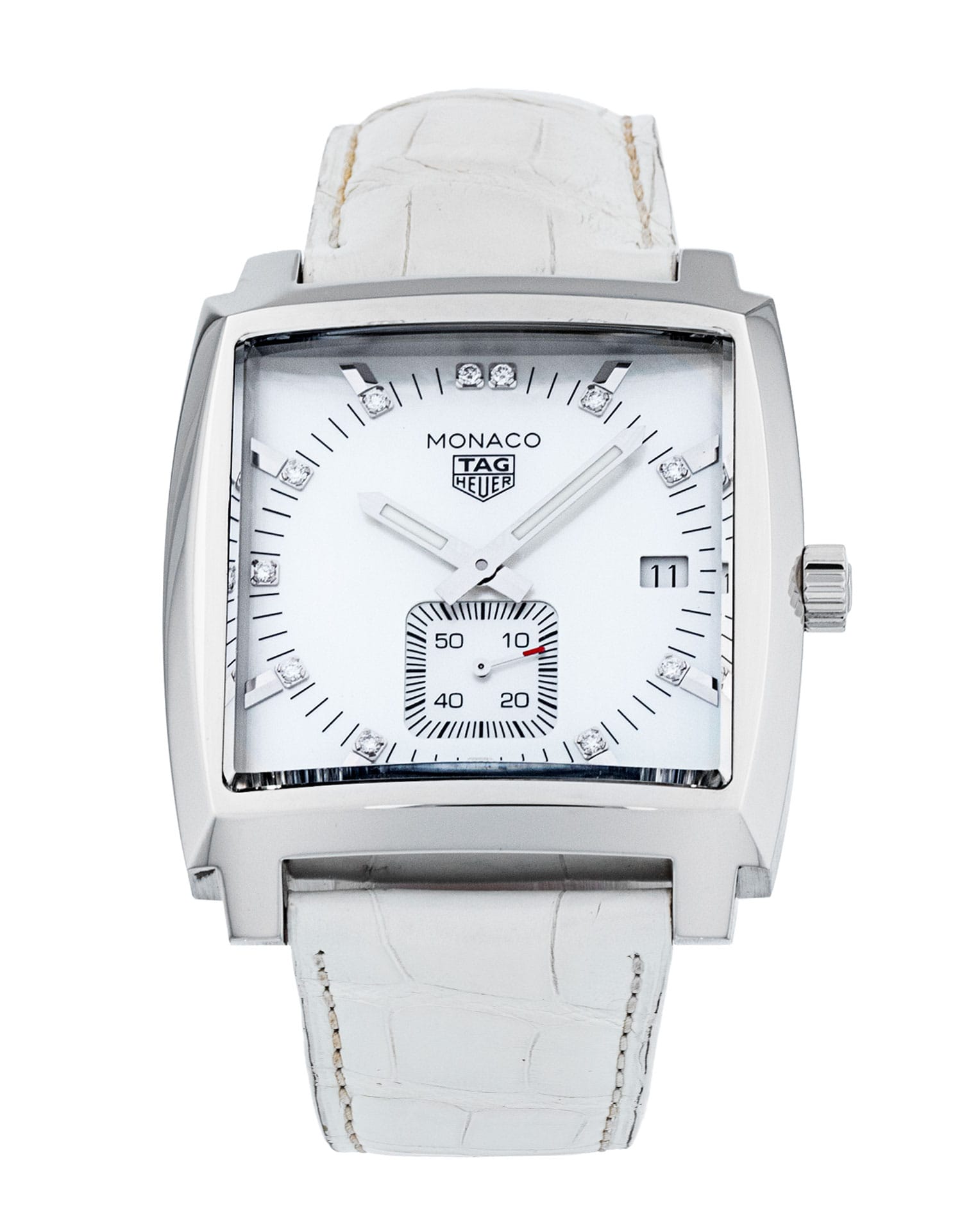 This Tag Heuer Monaco WAW131B.FC6247 has a mother of pearl white - diamond dial and a leather strap. This Tag Heuer has undergone a thorough inspection of accuracy, functionality and condition at our Tag Heuer certified service centre to determine the level of reconditioning required to meet our strict standards. It has also been checked against our records to ensure authenticity. All our watches have a 24-month warranty for your peace of mind.