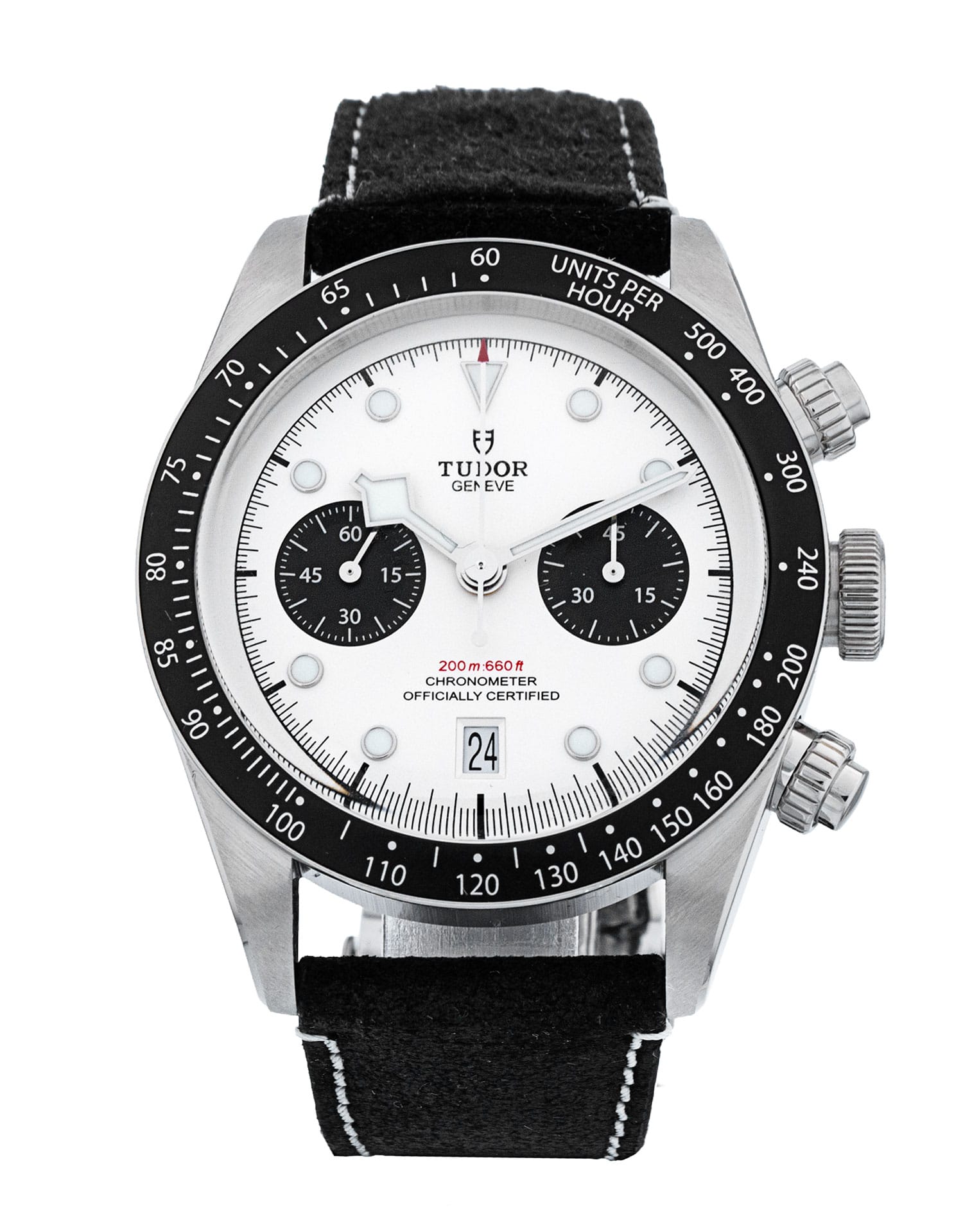 This Tudor Black Bay Chrono M79360N-0006 has a white dial and a leather strap. This Tudor has undergone a thorough inspection of water resistance, accuracy, functionality and condition to determine the level of reconditioning required to meet our strict standards. It has also been referenced against technical documents and manufacturer records where available to ensure authenticity and a clean history. Our watches have a 24-month warranty for your peace of mind, in conjunction with any remaining manufacturer’s warranty from new or from service. To maintain the manufacturer’s warranty on this watch, it has not been polished in our service centre.