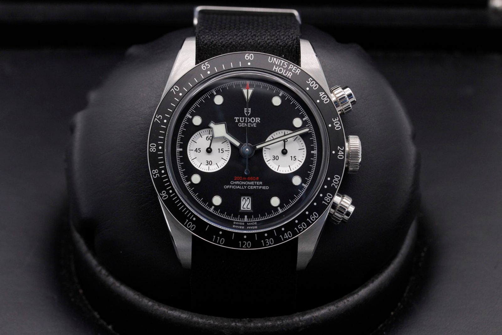 This Tudor Black Bay Chrono M79360N-0007 has a black dial and a fabric strap. This Tudor has undergone a thorough inspection of water resistance, accuracy, functionality and condition to determine the level of reconditioning required to meet our strict standards. It has also been referenced against technical documents and manufacturer records where available to ensure authenticity and a clean history. All our watches have a 24-month warranty for your peace of mind. One of our skilled polishing technicians has removed marks on the case and bracelet of this watch, brought about by daily wear and tear, which is why this watch does not come with the remaining manufacturer’s warranty.