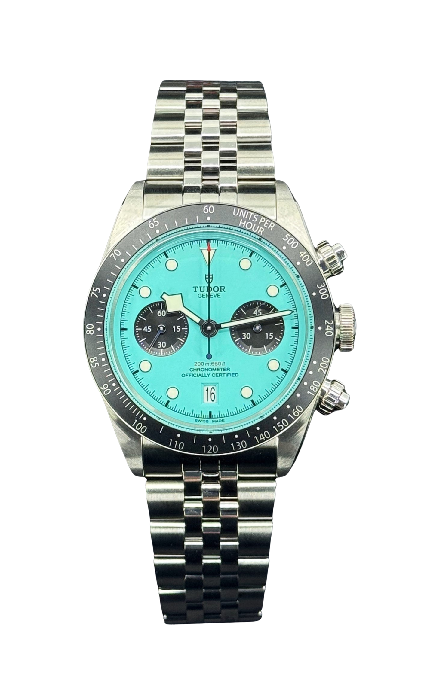 This Tudor Black Bay Chrono M79360N-0024 has a turquoise dial and a bracelet strap. This Tudor has undergone a thorough inspection of water resistance, accuracy, functionality and condition to determine the level of reconditioning required to meet our strict standards. It has also been referenced against technical documents and manufacturer records where available to ensure authenticity and a clean history. Our watches have a 24-month warranty for your peace of mind, in conjunction with any remaining manufacturer’s warranty from new or from service. To maintain the manufacturer’s warranty on this watch, it has not been polished in our service centre.