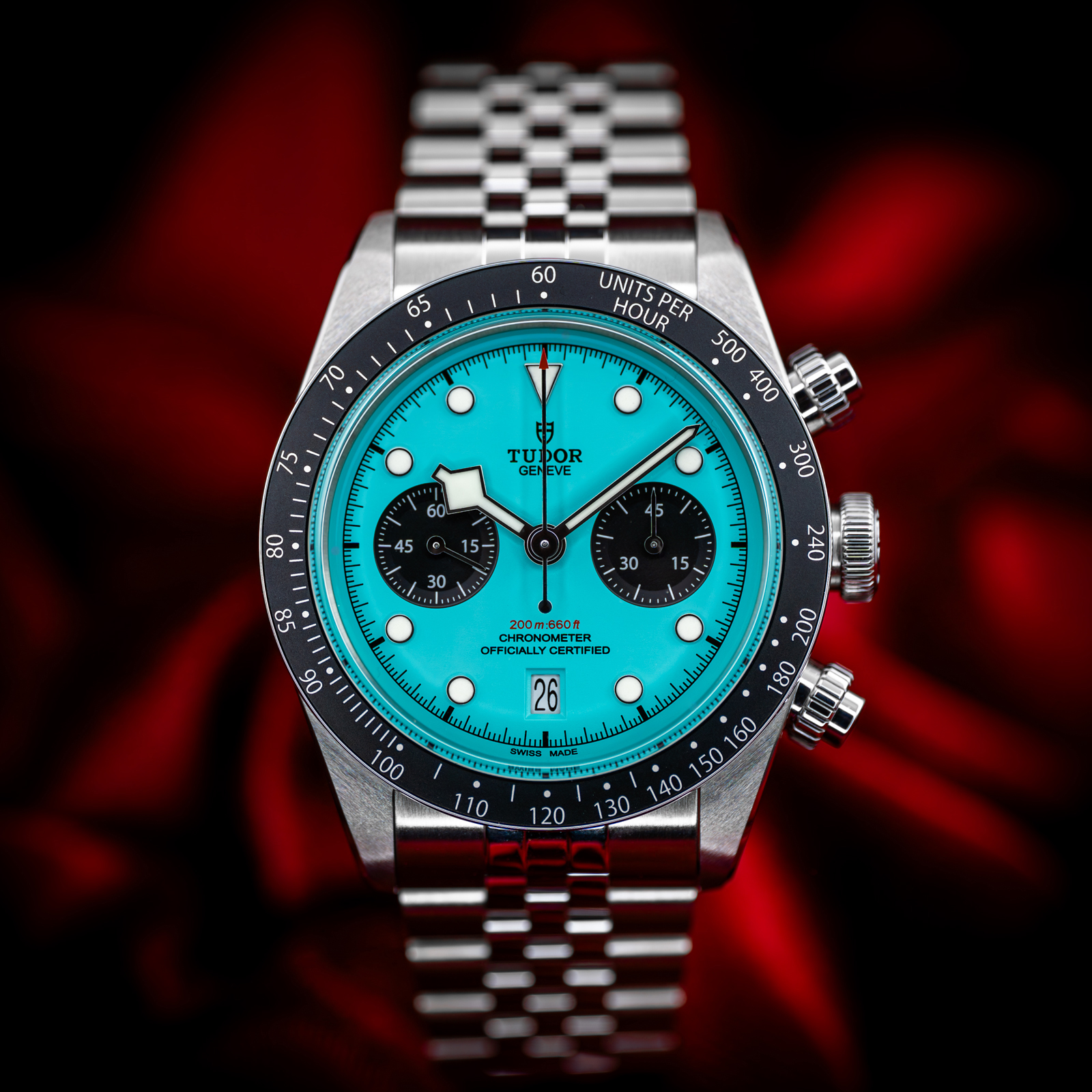 This Tudor Black Bay Chrono M79360N-0024 has a turquoise dial and a bracelet strap. This Tudor has undergone a thorough inspection of water resistance, accuracy, functionality and condition to determine the level of reconditioning required to meet our strict standards. It has also been referenced against technical documents and manufacturer records where available to ensure authenticity and a clean history. Our watches have a 24-month warranty for your peace of mind, in conjunction with any remaining manufacturer’s warranty from new or from service. To maintain the manufacturer’s warranty on this watch, it has not been polished in our service centre.