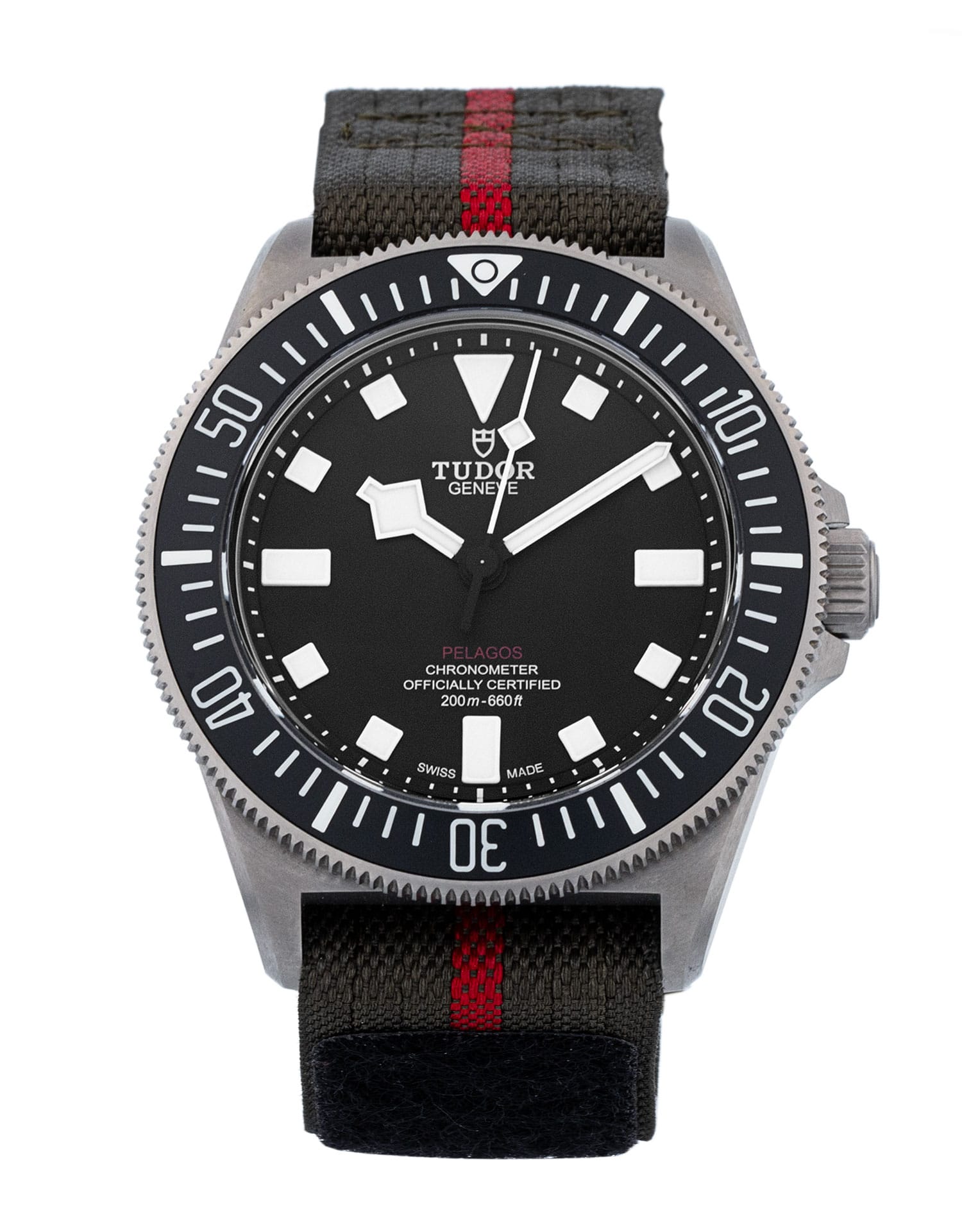 This Tudor Pelagos FXD M25717N-0001 has a black dial and a fabric strap. This Tudor has undergone a thorough inspection of water resistance, accuracy, functionality and condition to determine the level of reconditioning required to meet our strict standards. It has also been referenced against technical documents and manufacturer records where available to ensure authenticity and a clean history. Our watches have a 24-month warranty for your peace of mind, in conjunction with any remaining manufacturer’s warranty from new or from service. To maintain the manufacturer’s warranty on this watch, it has not been polished in our service centre.
