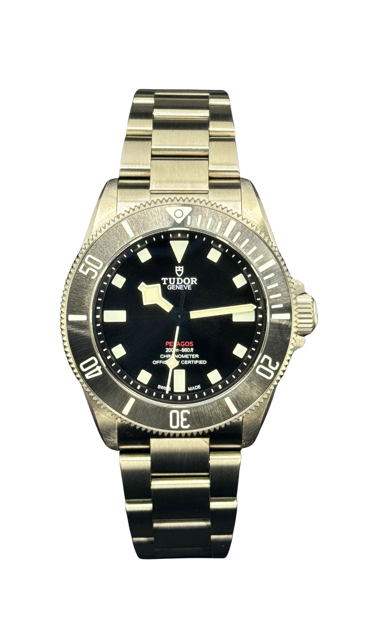 This Tudor Pelagos M25407N-0001 has a black dial and a bracelet strap. This Tudor has undergone a thorough inspection of water resistance, accuracy, functionality and condition to determine the level of reconditioning required to meet our strict standards. It has also been referenced against technical documents and manufacturer records where available to ensure authenticity and a clean history. Our watches have a 24-month warranty for your peace of mind, in conjunction with any remaining manufacturer’s warranty from new or from service. To maintain the manufacturer’s warranty on this watch, it has not been polished in our service centre.