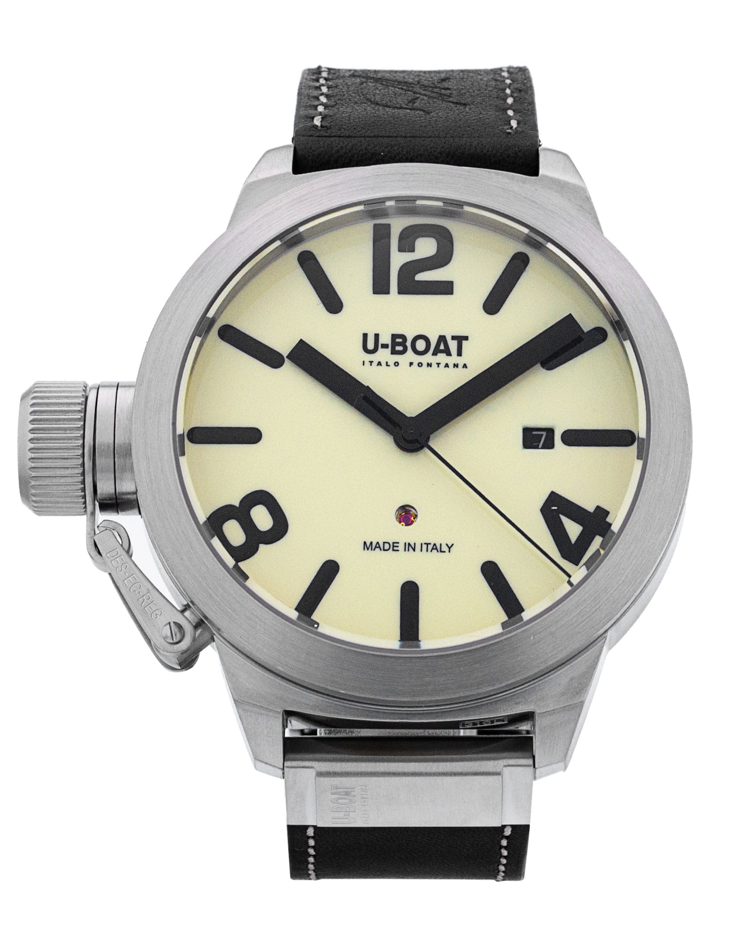 This U-Boat Classico 1820/5565 has a beige arabic dial and a leather strap. This U-Boat has undergone a thorough inspection of water resistance, accuracy, functionality and condition to determine the level of reconditioning required to meet our strict standards. It has also been referenced against technical documents and manufacturer records where available to ensure authenticity and a clean history. All our watches have a 24-month warranty for your peace of mind.