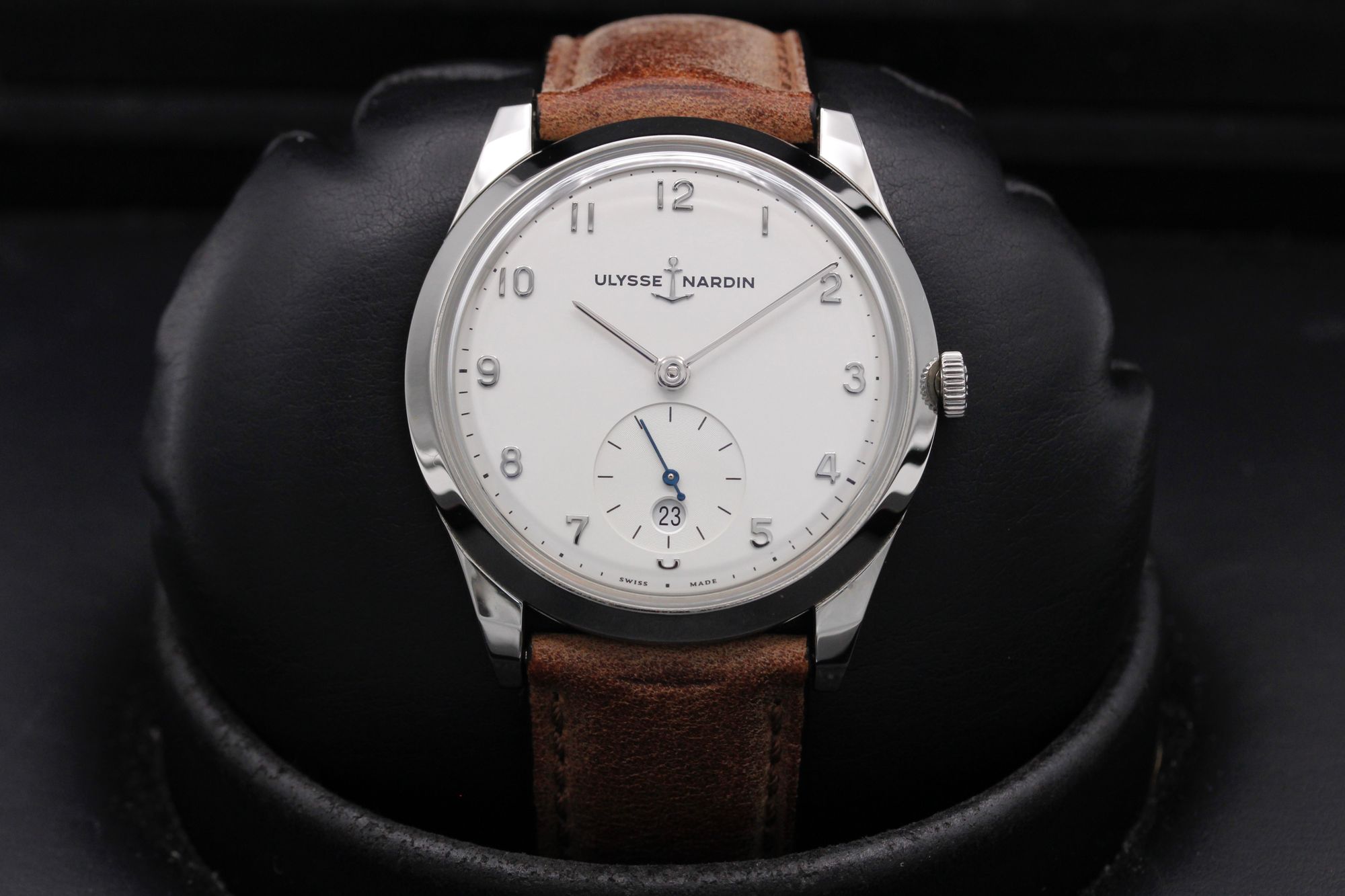 This Ulysse Nardin Classico 3203-900 has a silver arabic dial and a leather strap. This Ulysse Nardin has undergone a thorough inspection of water resistance, accuracy, functionality and condition to determine the level of reconditioning required to meet our strict standards. It has also been referenced against technical documents and manufacturer records where available to ensure authenticity and a clean history. All our watches have a 24-month warranty for your peace of mind.