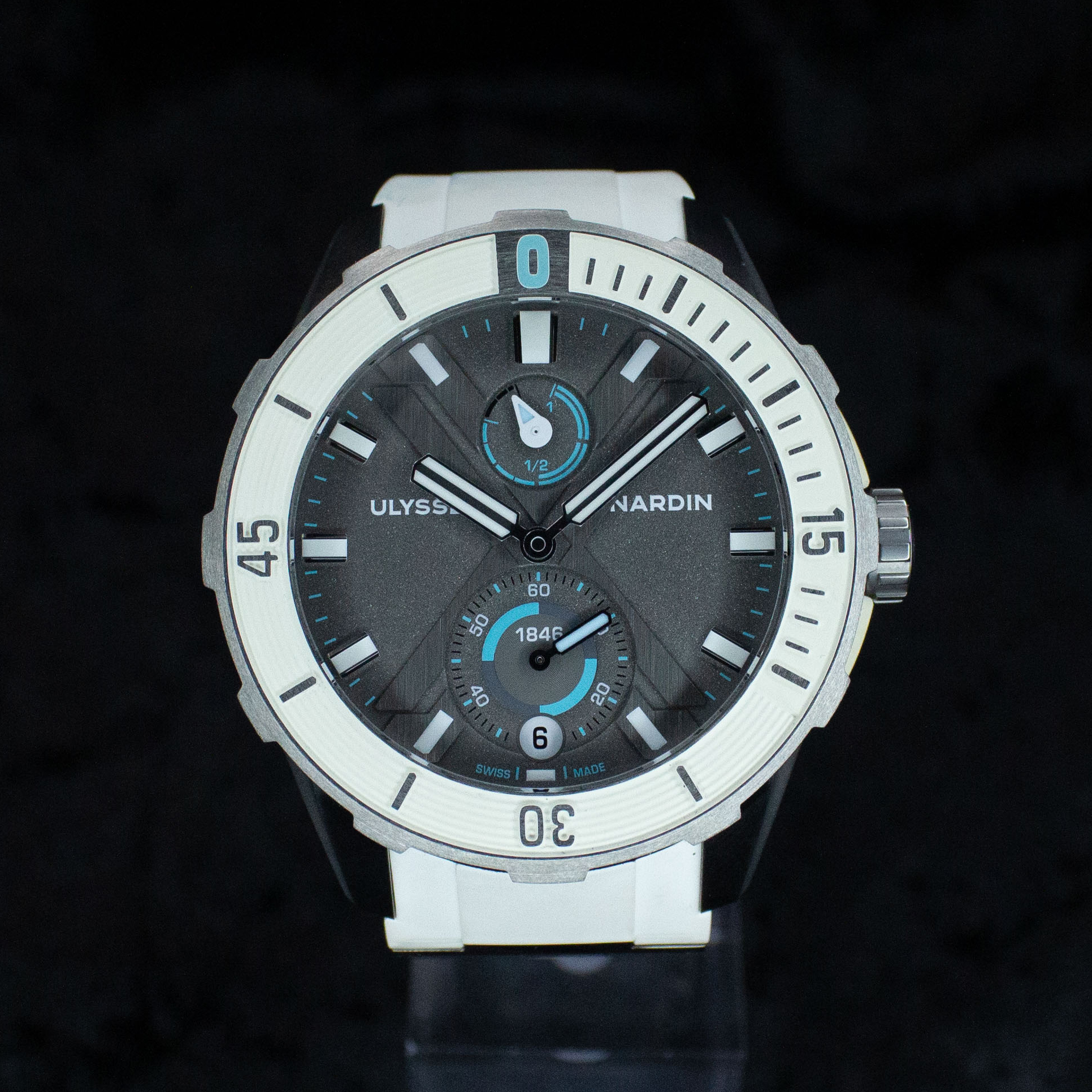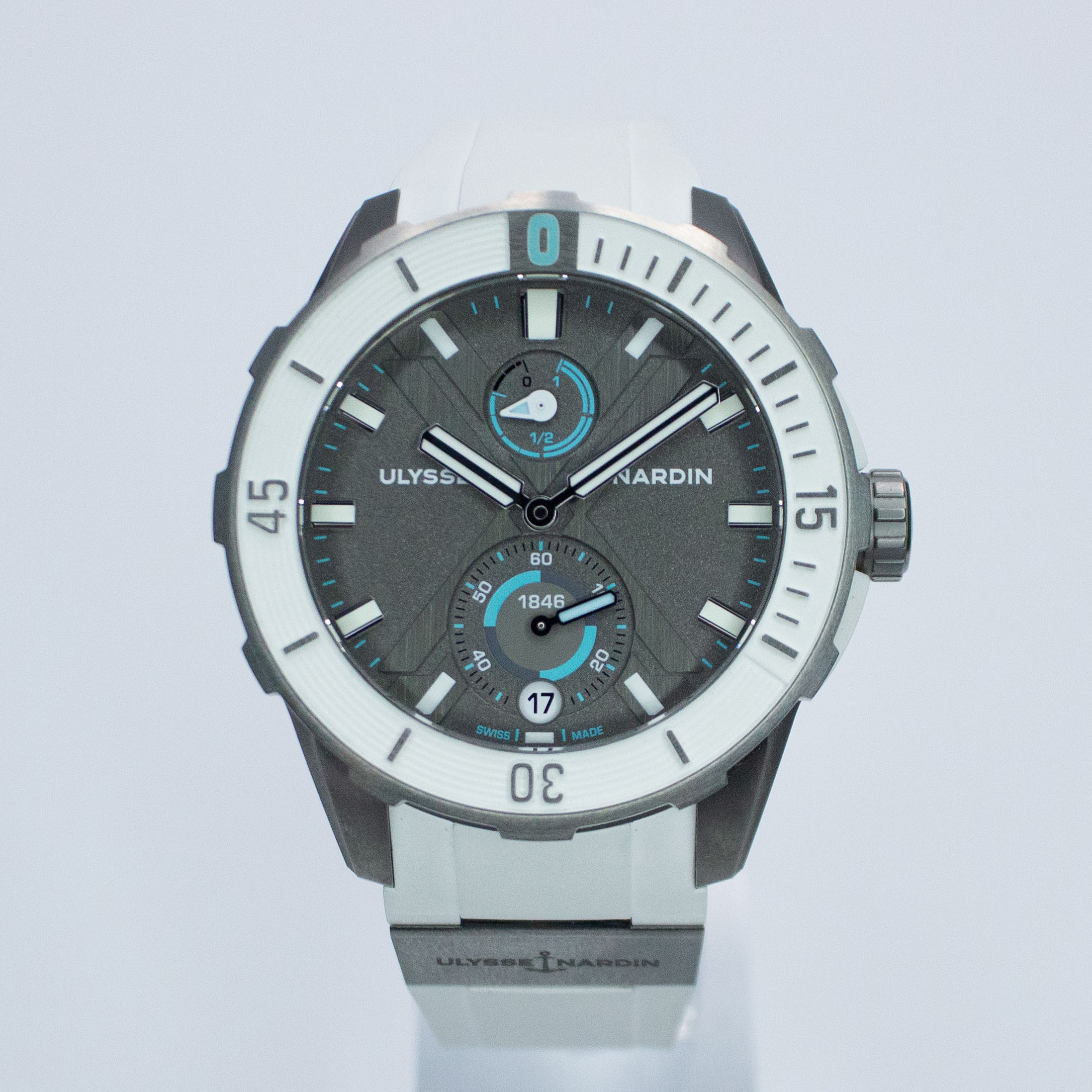 This Ulysse Nardin Diver collection 1183-170LE-3/90-ANT has a grey dial and a rubber strap. This Ulysse Nardin has undergone a thorough inspection of water resistance, accuracy, functionality and condition to determine the level of reconditioning required to meet our strict standards. It has also been referenced against technical documents and manufacturer records where available to ensure authenticity and a clean history. All our watches have a 24-month warranty for your peace of mind.