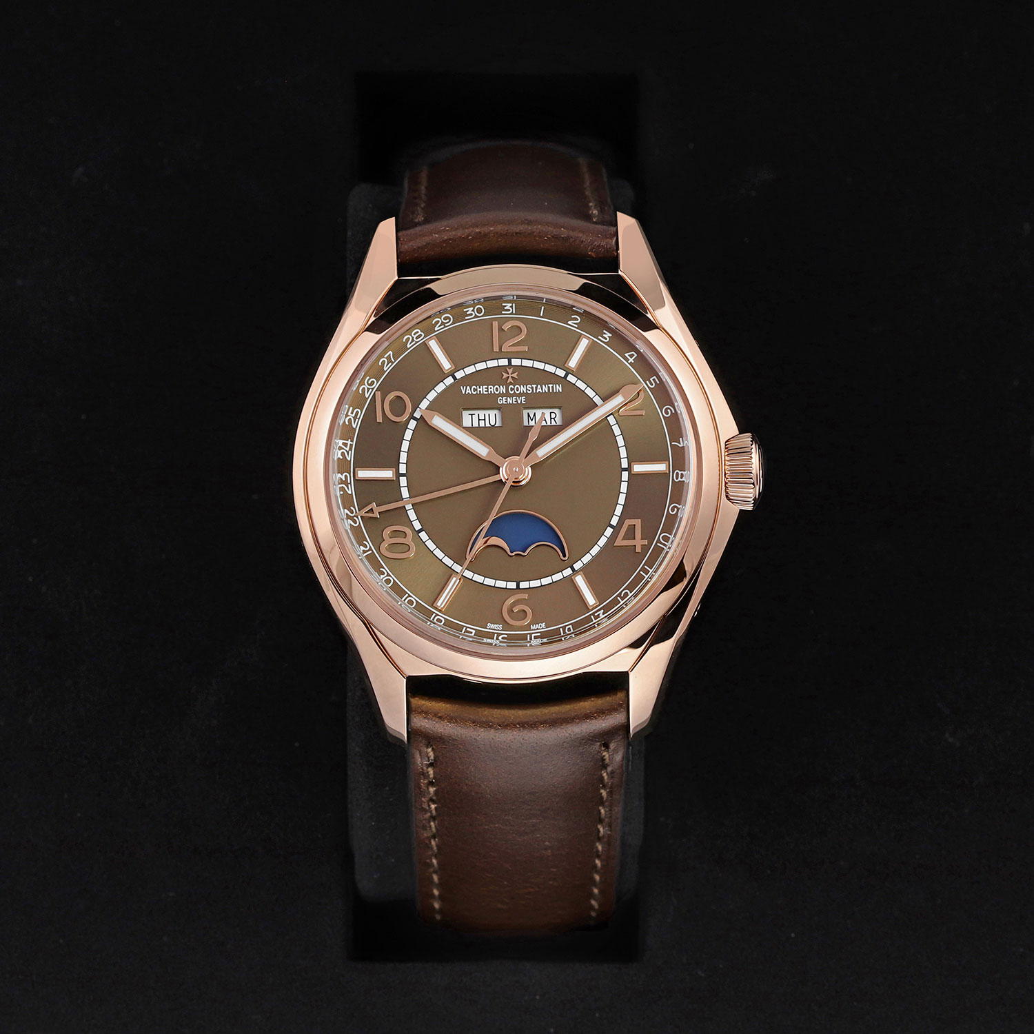 This Vacheron Constantin Fiftysix 4000E/000R-B065 has a brown arabic dial and a leather strap. This Vacheron Constantin has undergone a thorough inspection of accuracy, functionality and condition at our Vacheron Constantin certified service centre to determine the level of reconditioning required to meet our strict standards. It has also been checked against our records to ensure authenticity. All our watches have a 24-month warranty for your peace of mind.