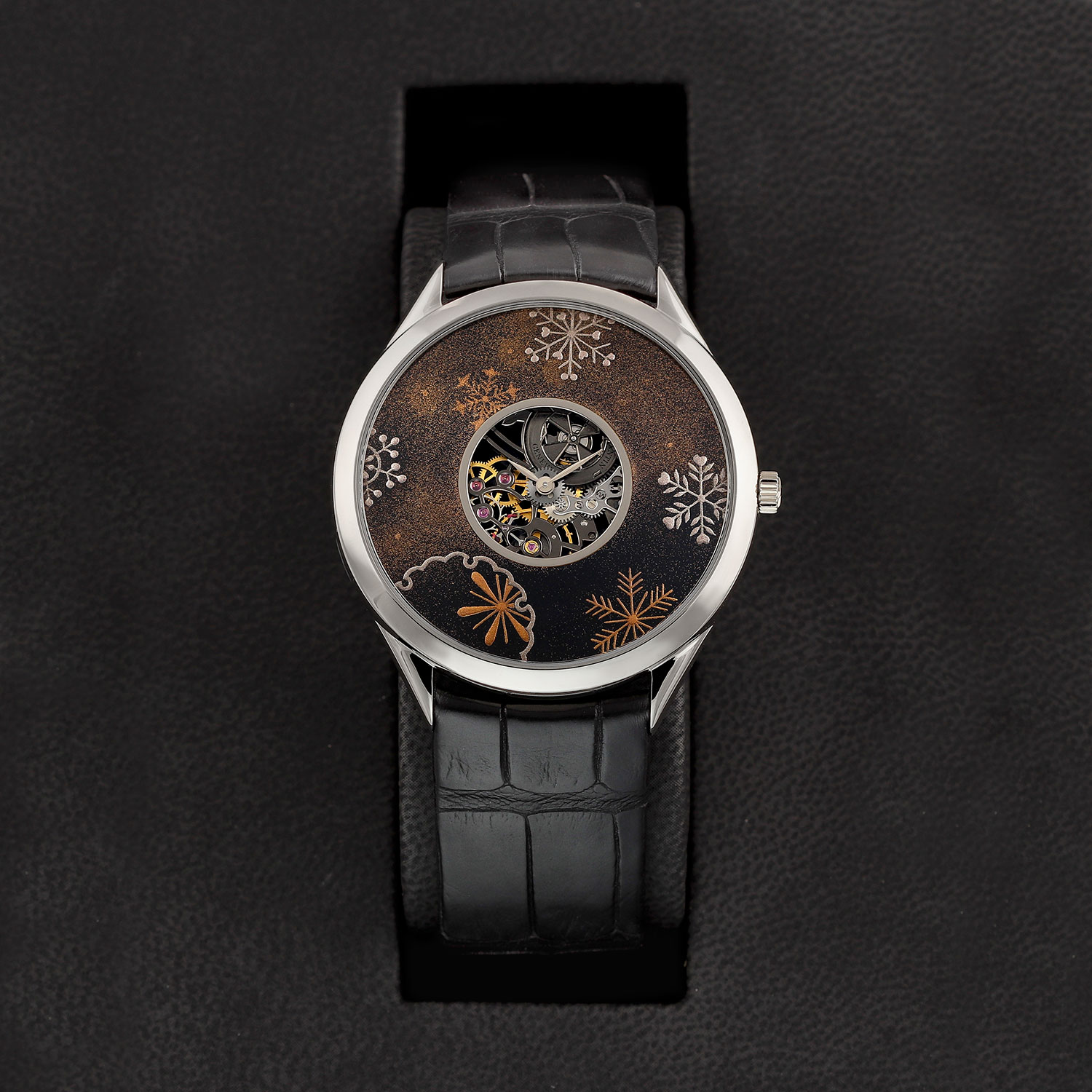This Vacheron Constantin Metiers d'Art 33222/000G-9706 has a black dial and a leather strap. This Vacheron Constantin has undergone a thorough inspection of accuracy, functionality and condition at our Vacheron Constantin certified service centre to determine the level of reconditioning required to meet our strict standards. It has also been checked against our records to ensure authenticity. All our watches have a 24-month warranty for your peace of mind.