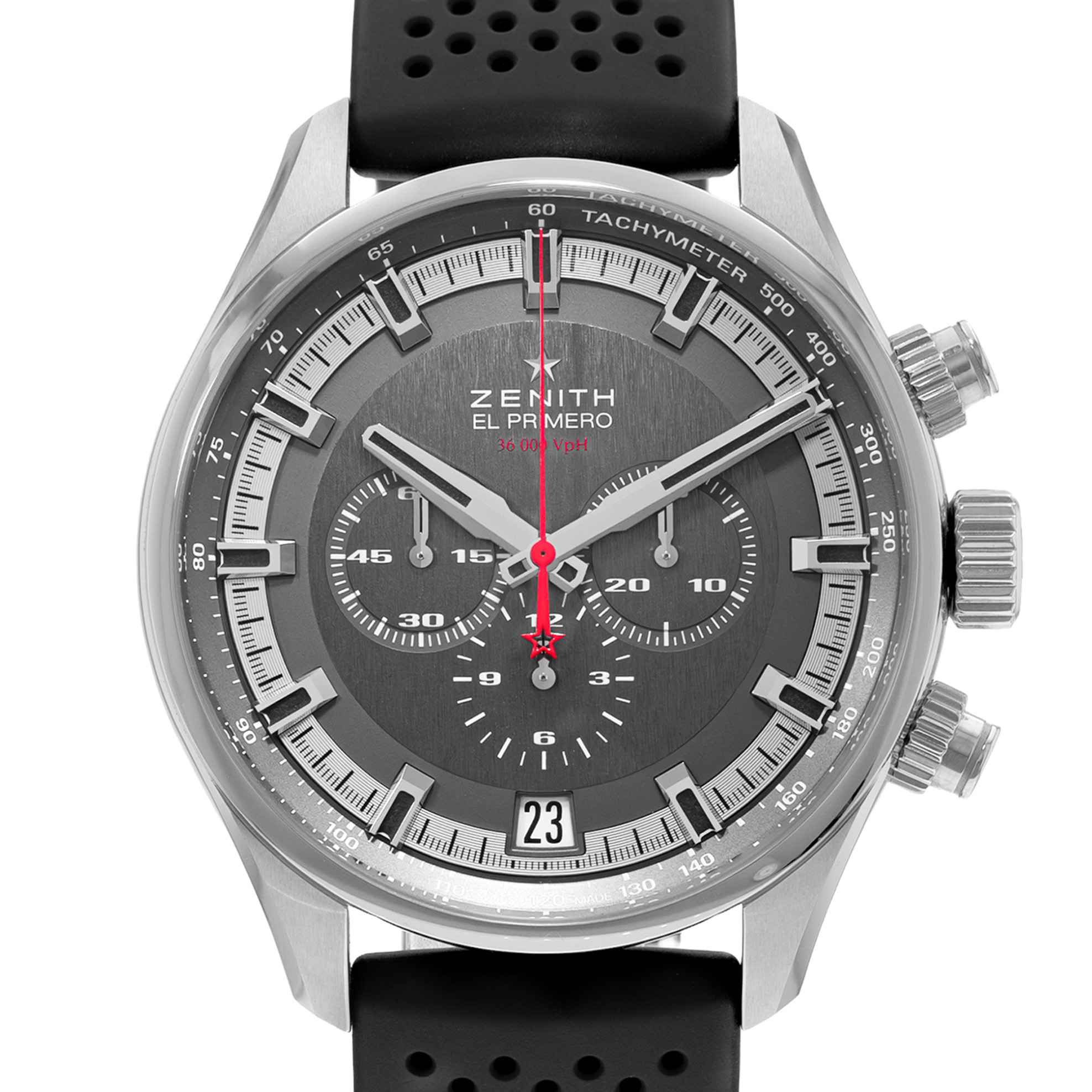 This Zenith Chronomaster El Primero 03.2280.400/91.R576 has a dark grey baton dial and a rubber strap. This Zenith has undergone a thorough inspection of water resistance, accuracy, functionality and condition to determine the level of reconditioning required to meet our strict standards. It has also been referenced against technical documents and manufacturer records where available to ensure authenticity and a clean history. All our watches have a 24-month warranty for your peace of mind.