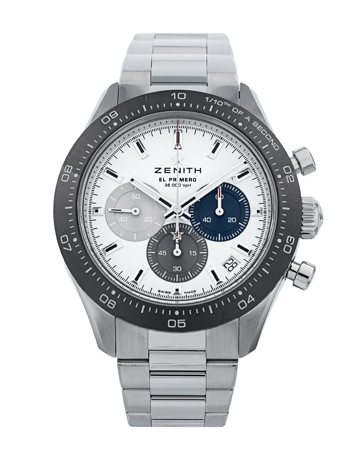 This Zenith Chronomaster 03.3100.3600/69.M3100 has a white baton dial and a bracelet strap. This Zenith has undergone a thorough inspection of water resistance, accuracy, functionality and condition to determine the level of reconditioning required to meet our strict standards. It has also been referenced against technical documents and manufacturer records where available to ensure authenticity and a clean history. Our watches have a 24-month warranty for your peace of mind, in conjunction with any remaining manufacturer’s warranty from new or from service.