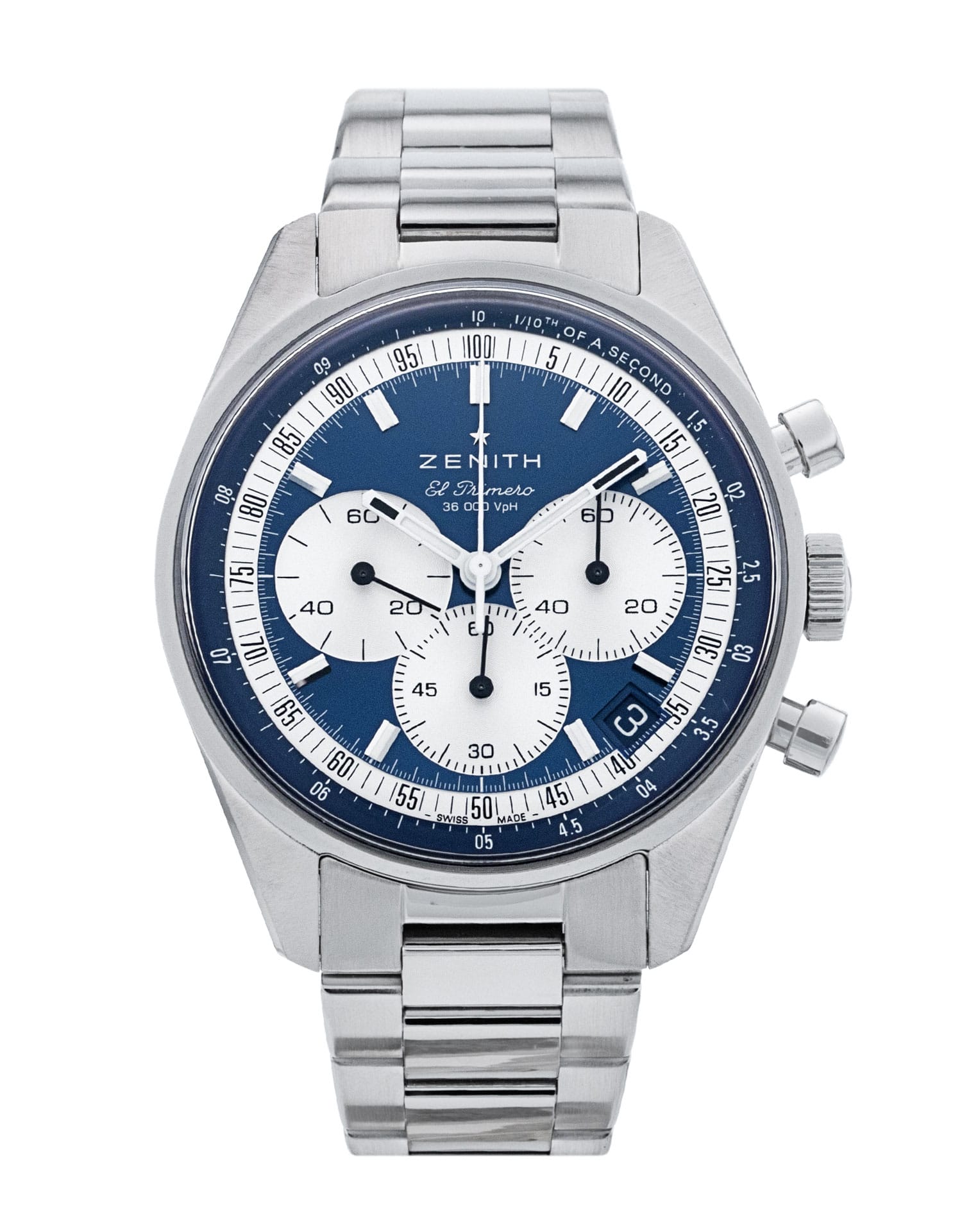 This Zenith Chronomaster 03.3200.3600/51.M3200 has a blue dial and a bracelet strap. This Zenith has undergone a thorough inspection of water resistance, accuracy, functionality and condition to determine the level of reconditioning required to meet our strict standards. It has also been referenced against technical documents and manufacturer records where available to ensure authenticity and a clean history. All our watches have a 24-month warranty for your peace of mind.