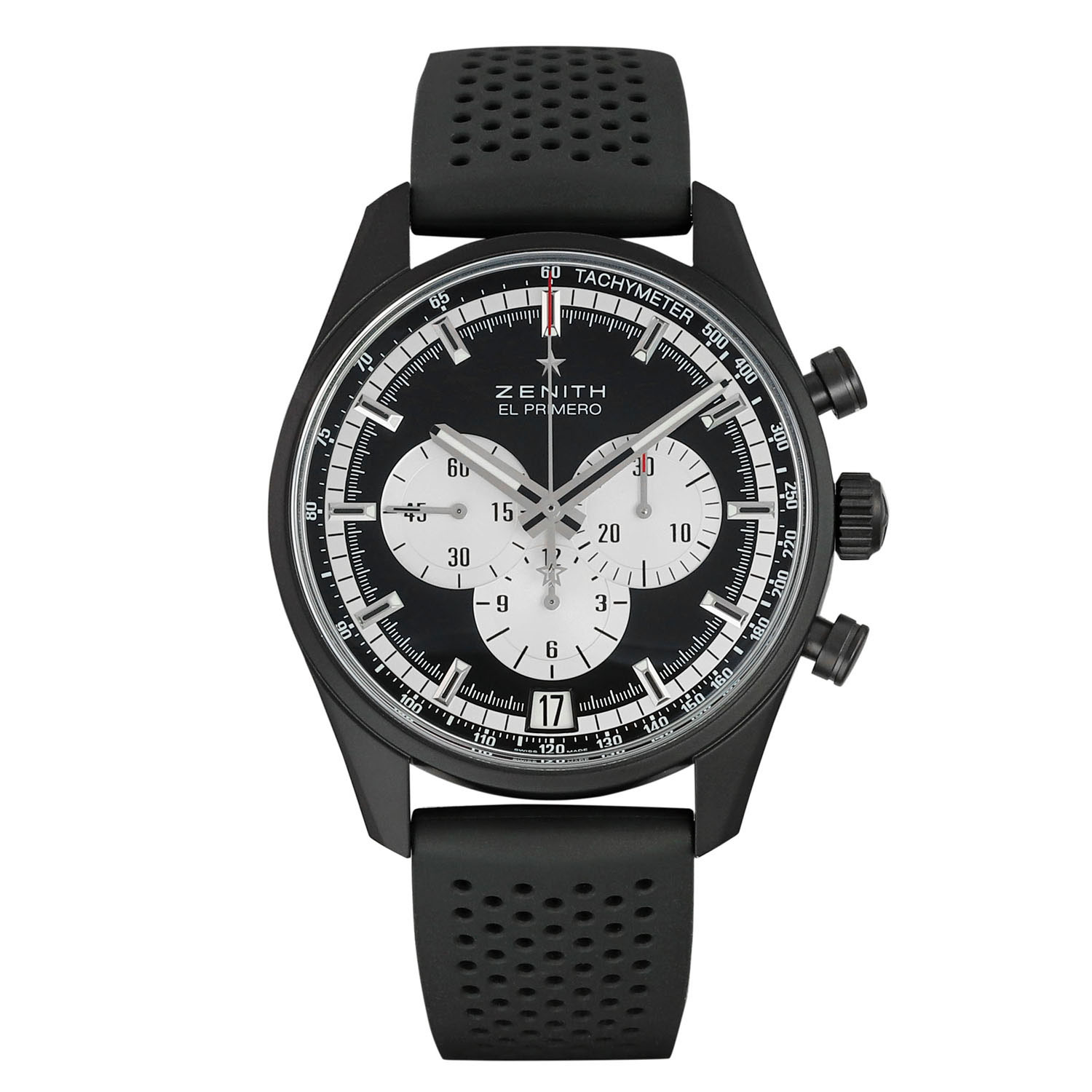 This Zenith Chronomaster 24.2041.400/21.R576 has a black baton dial and a rubber strap. This Zenith has undergone a thorough inspection of water resistance, accuracy, functionality and condition to determine the level of reconditioning required to meet our strict standards. It has also been referenced against technical documents and manufacturer records where available to ensure authenticity and a clean history. Our watches have a 24-month warranty for your peace of mind, in conjunction with any remaining manufacturer’s warranty from new or from service.