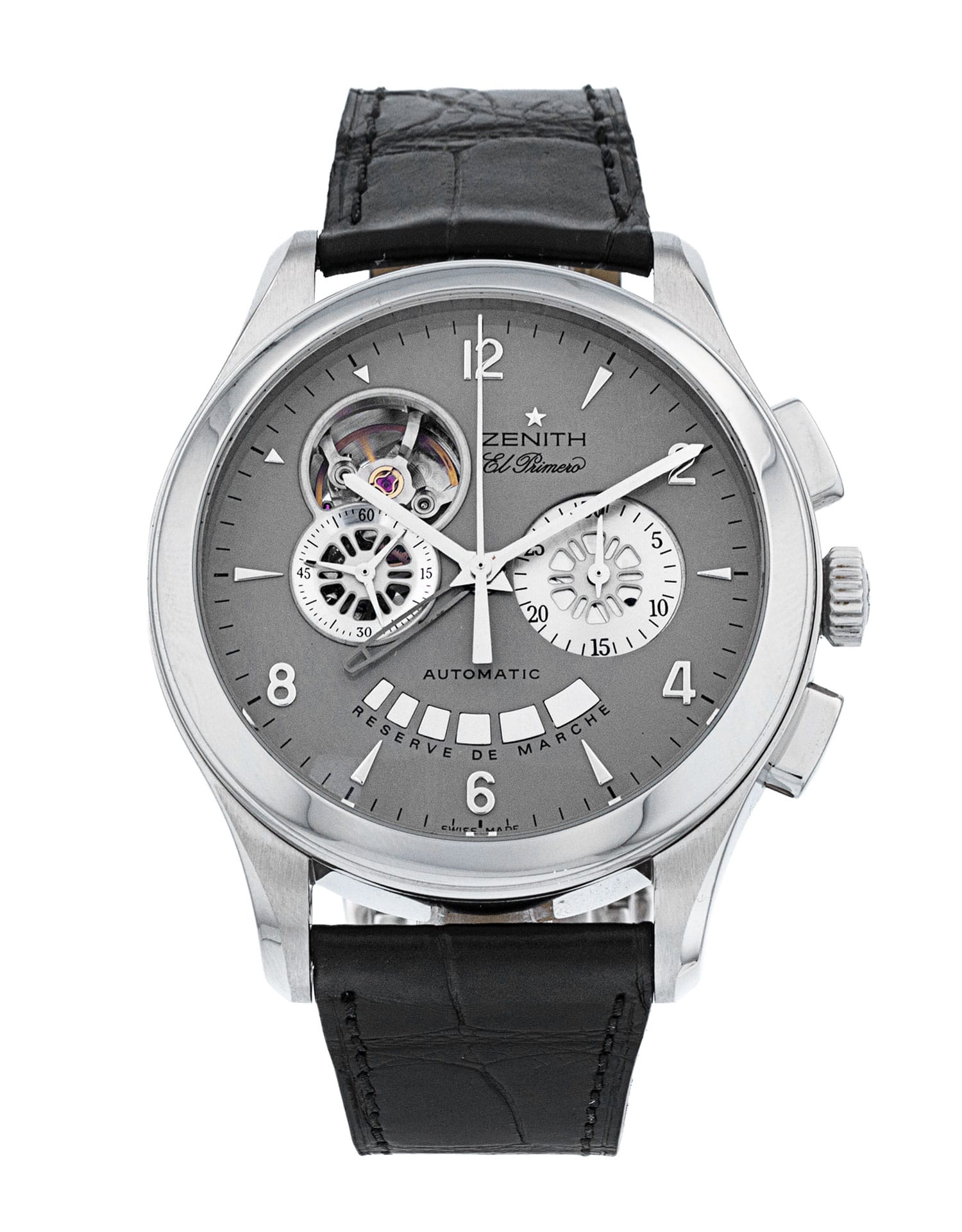 This Zenith El Primero 03.0510.4021/73.C492 has a grey arabic dial and a leather strap. This Zenith has undergone a thorough inspection of water resistance, accuracy, functionality and condition to determine the level of reconditioning required to meet our strict standards. It has also been referenced against technical documents and manufacturer records where available to ensure authenticity and a clean history. All our watches have a 24-month warranty for your peace of mind.