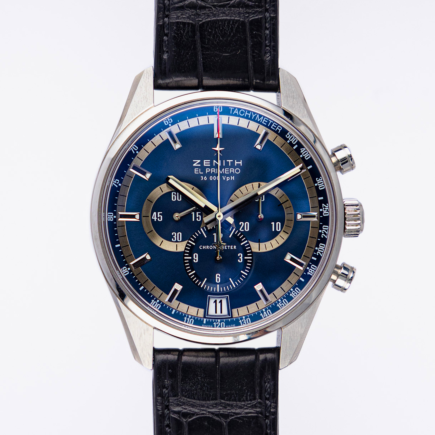 This Zenith El Primero 03.2041.400/51.C496 has a blue baton dial and a leather strap. This Zenith has undergone a thorough inspection of water resistance, accuracy, functionality and condition to determine the level of reconditioning required to meet our strict standards. It has also been referenced against technical documents and manufacturer records where available to ensure authenticity and a clean history. All our watches have a 24-month warranty for your peace of mind.