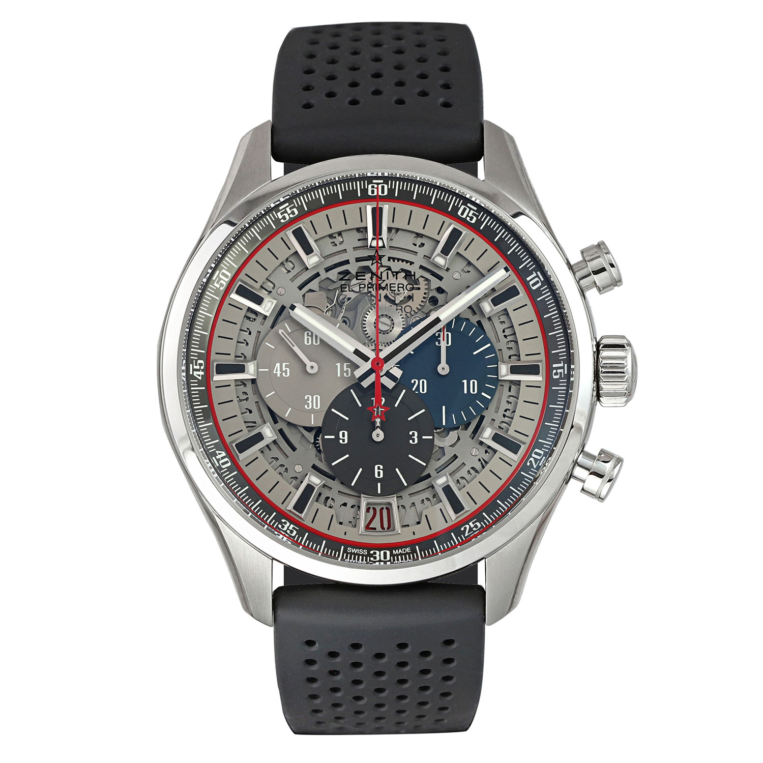 This Zenith El Primero 03.2522.400/69.R576 has a grey dial and a rubber strap. This Zenith has undergone a thorough inspection of water resistance, accuracy, functionality and condition to determine the level of reconditioning required to meet our strict standards. It has also been referenced against technical documents and manufacturer records where available to ensure authenticity and a clean history. All our watches have a 24-month warranty for your peace of mind.