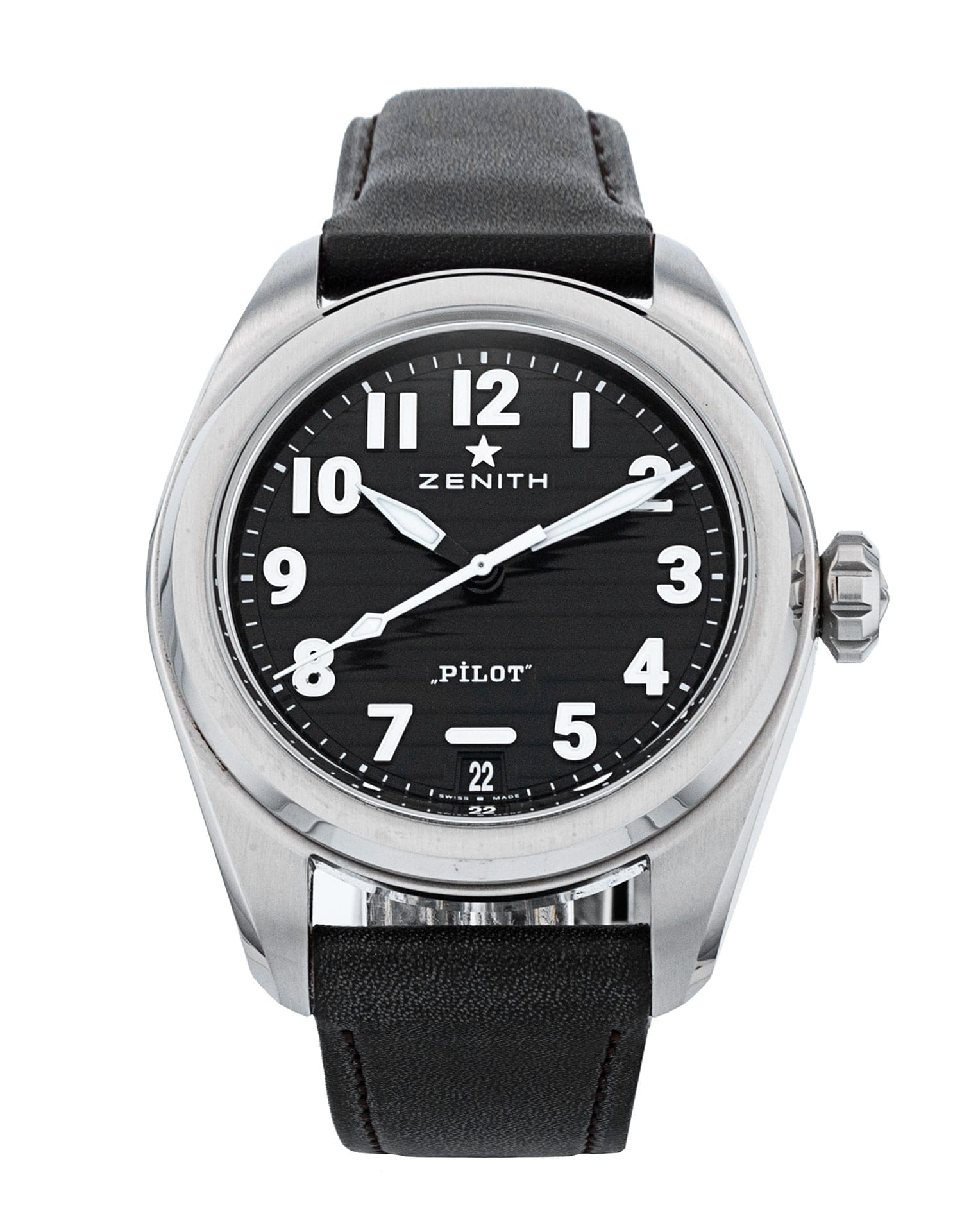 This Zenith Pilot 03.4000.3620/21.I001 has a black arabic dial and a leather strap. This Zenith has undergone a thorough inspection of water resistance, accuracy, functionality and condition to determine the level of reconditioning required to meet our strict standards. It has also been referenced against technical documents and manufacturer records where available to ensure authenticity and a clean history. All our watches have a 24-month warranty for your peace of mind.